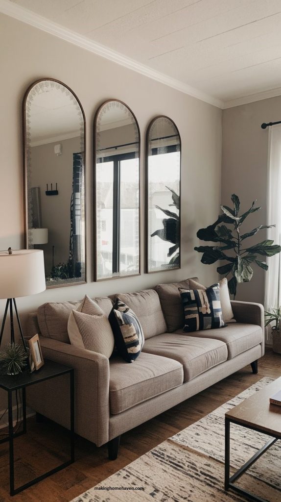 Adding three large mirrors above your sofa can make your living space stylish. These mirrors not only catch the eye but also make the room seem bigger. Choose frames that match your decor to enhance the look.