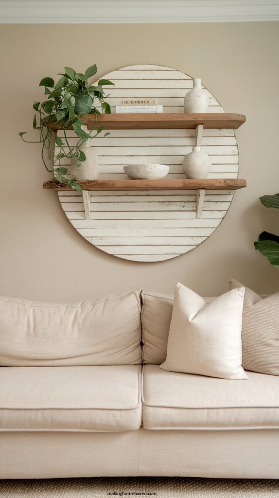 Floating shelves make a room feel bigger and more open. Pinterest and Instagram are great for new ideas. Adding farmhouse touches, like big clocks or vintage items, can make your space special. These tips help turn any wall into a beautiful focal point.