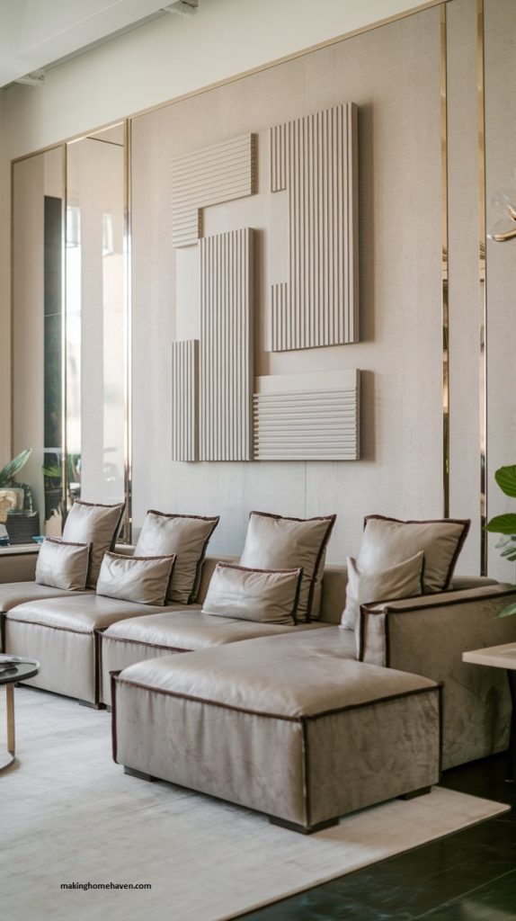 Add a touch of modern sophistication to your living room. Decorate the wall behind your couch with abstract geometric art in neutral tones. Choose pieces with clean, curved lines and raised textures.