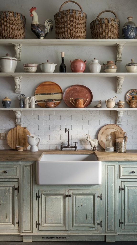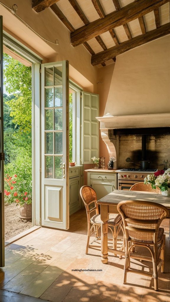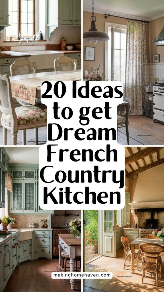 Don’t forget charming accessories like vintage clocks or flowers. They complete the French country kitchen feel.