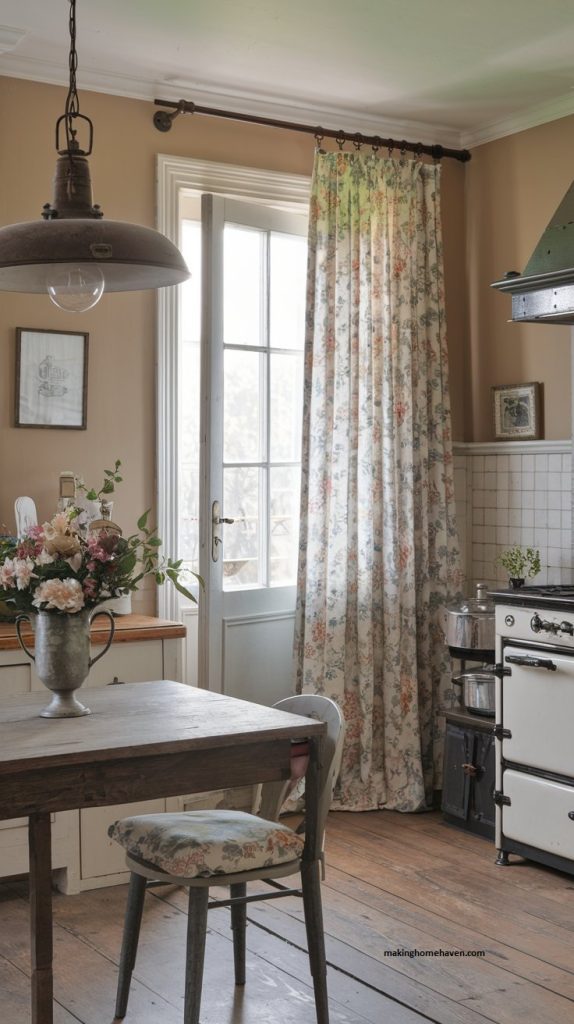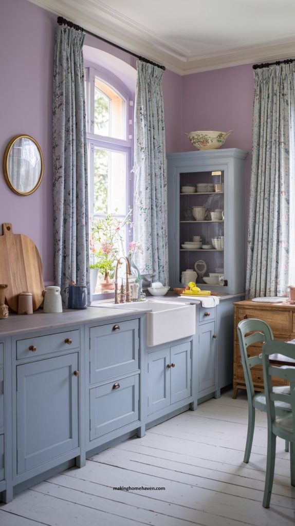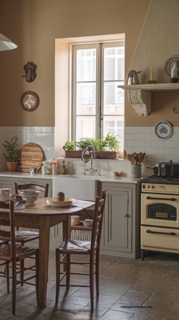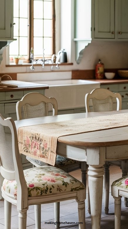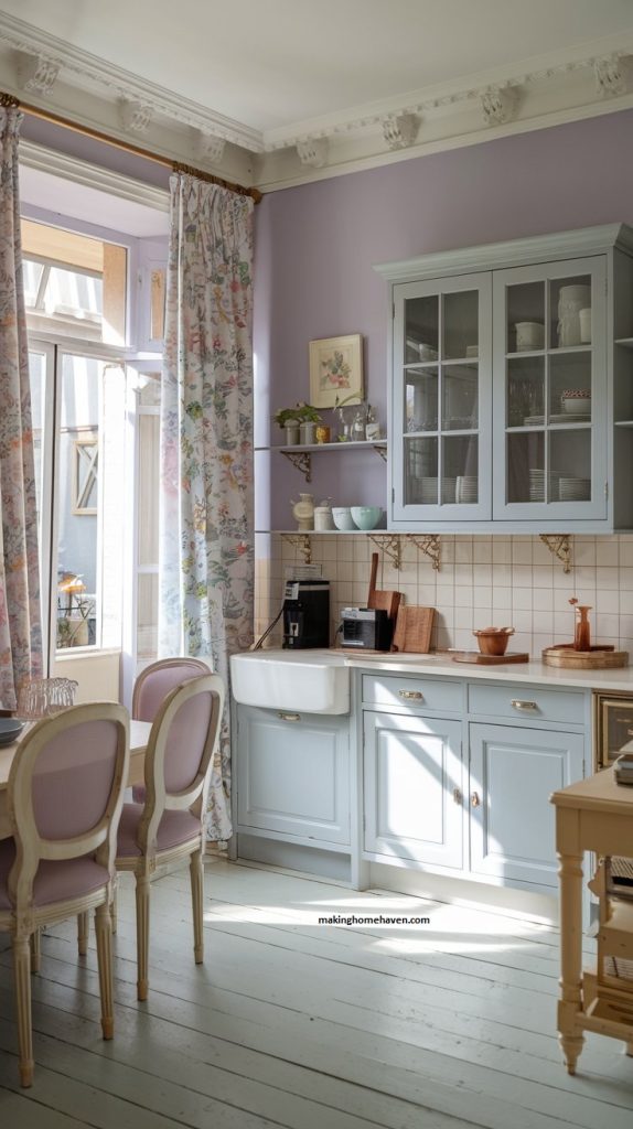 A soft pastel color palette brings calm and warmth. It’s perfect for a cozy French country kitchen.