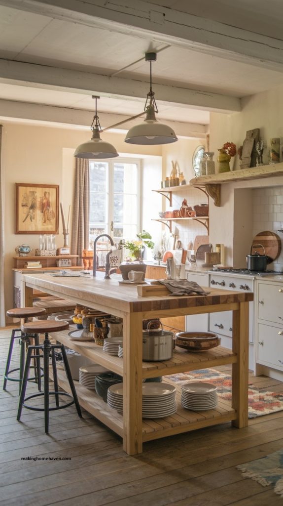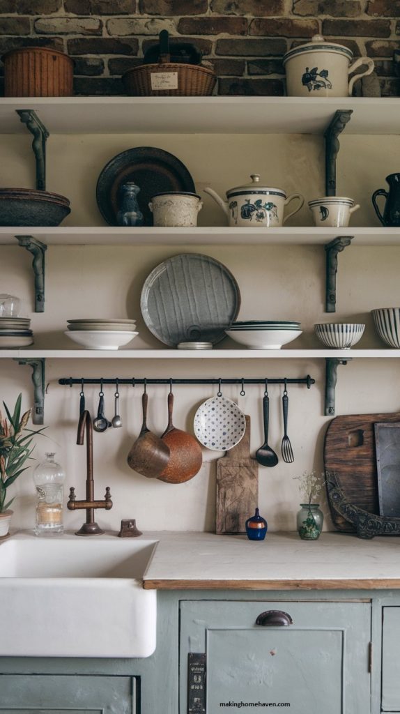 Open shelving is great for showing off rustic dishes or decorations. It makes things easy to reach.