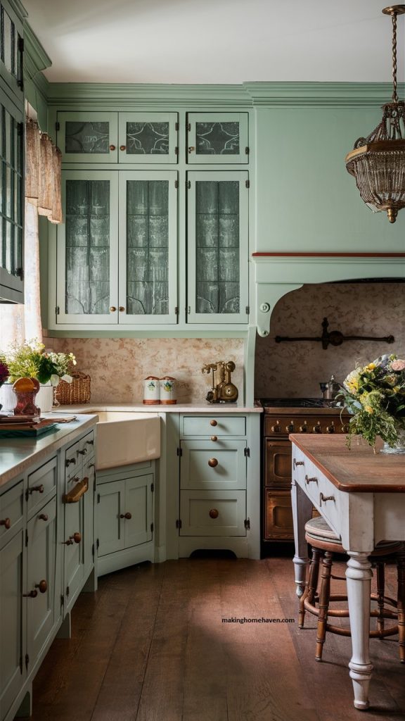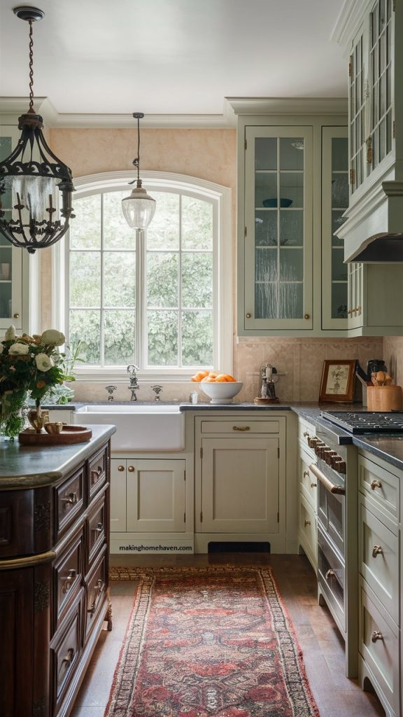 Cabinetry with ornate details can make storage look artistic. Vintage accessories like crystal chandeliers and copper cookware add whimsy. These touches make your kitchen warm and inviting.
