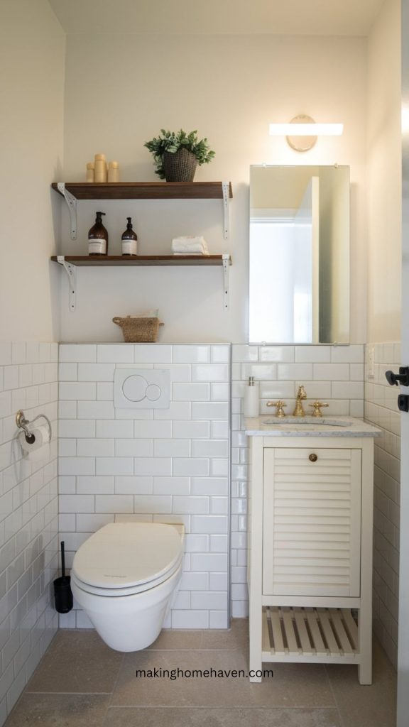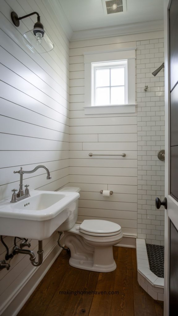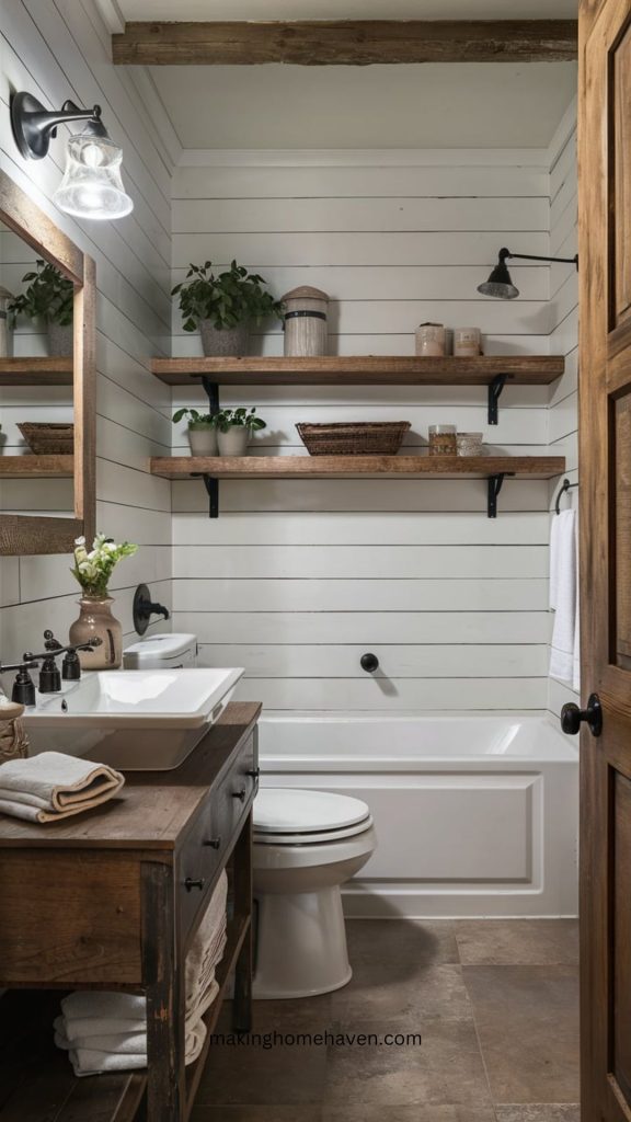Make your small bathroom cozy and farmhouse-like without spending a lot. Use reclaimed wood for shelves or vanities to add a rustic feel. Shaker-style cabinets and vintage mirrors also bring in the farmhouse look.
