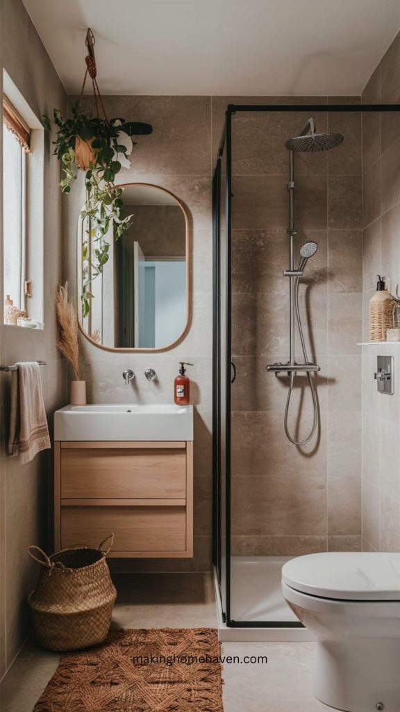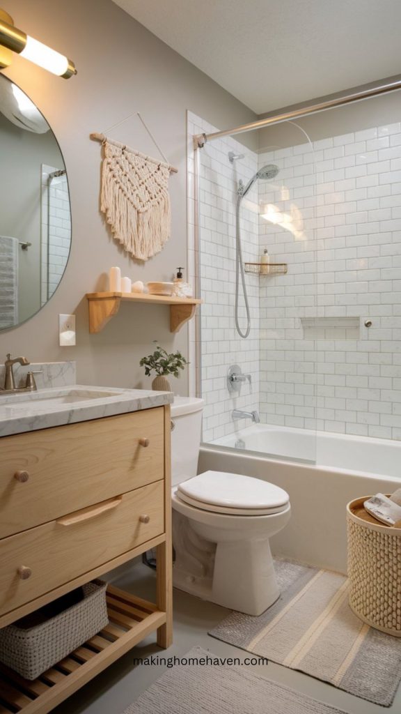 Combining bohemian minimalist decor makes your small bathroom inviting and stylish. Use earthy colors and natural materials for a warm feel. Add textures with woven baskets, simple artwork, or plants.