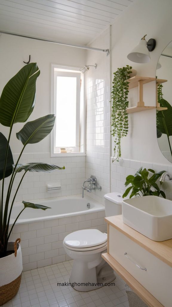 Use light colors on walls to bring in a garden feel. This makes your bathroom look bigger and more inviting. Plants, whether tall or small, change the mood. They turn a simple space into a peaceful place filled with nature.