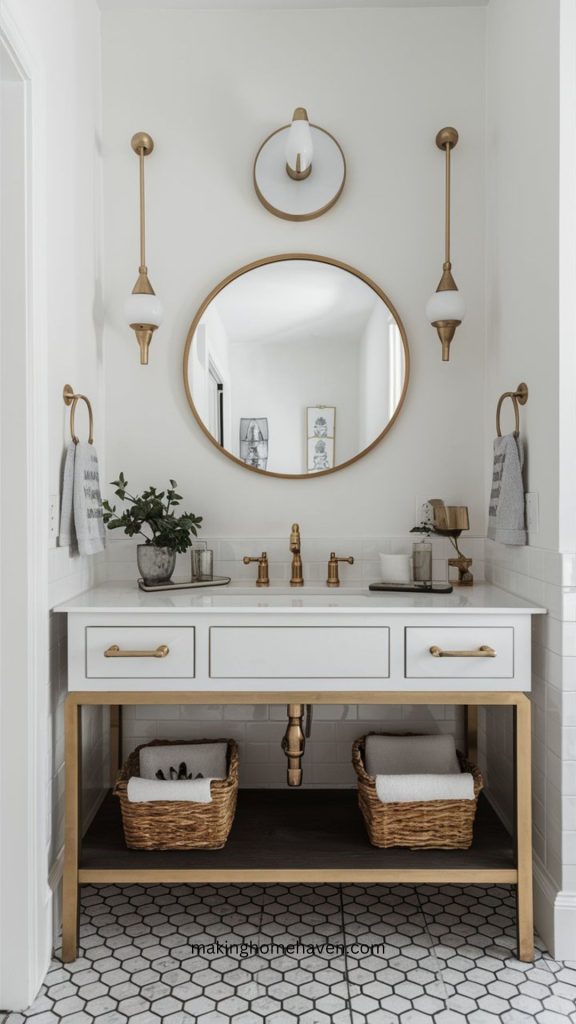Adding small bathroom gold accents brings elegance to your space. Use gold or brass for faucets, cabinet handles, and light fixtures. These touches make your bathroom look luxurious.