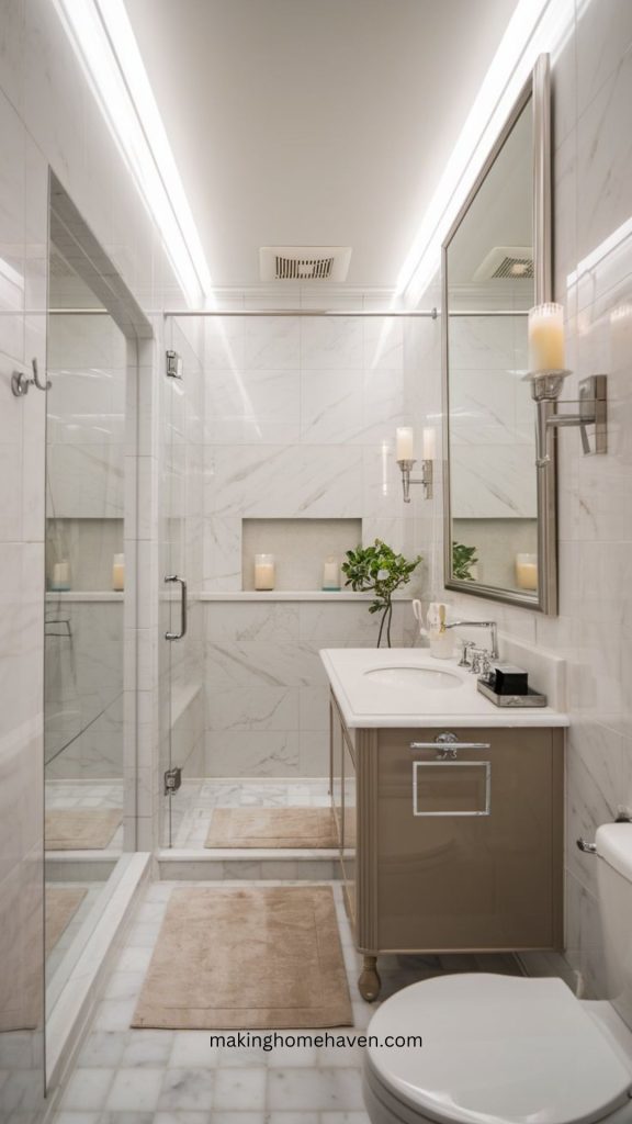 An oversized mirror can make your bathroom look bigger. It reflects light and adds to the illusion of space. This is a great way to maximize style in small bathrooms.