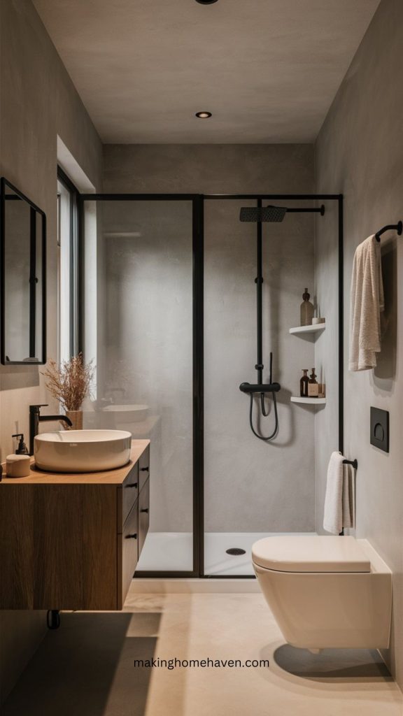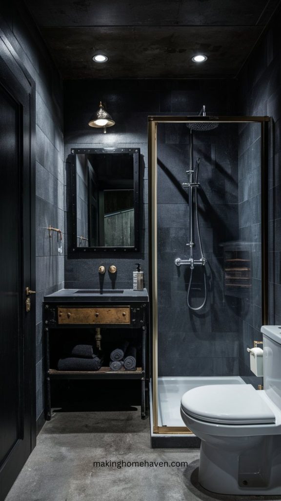 Make your small bathroom look stylish with an industrial touch. Use exposed pipe shelving and metal fixtures for a rugged look. These add a modern feel while keeping things functional. Soft lighting can warm up the space, making it cozy.