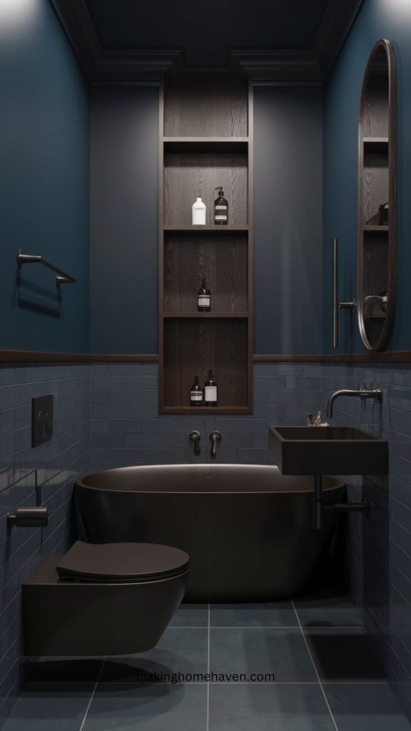 Creating a masculine elegance bathroom is a unique way to show off sophistication and modern design. Use darker colors like navy, charcoal, or deep green for a rich look. Add matte black hardware to contrast and make the space sleek.