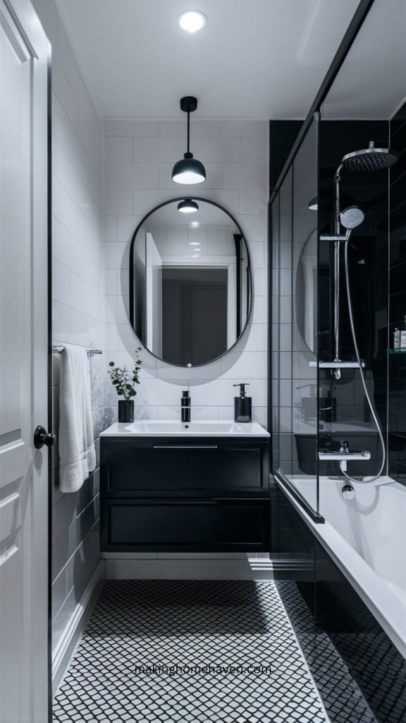 Adding patterns, like on the floor or walls, brings depth without making it too busy. A simple geometric pattern or a bold stripe catches the eye. It keeps the minimalist look you want. Make sure your black and white bathroom has clean lines and simple fixtures. This keeps it looking put together and stylish. It also makes a calm place for relaxing.