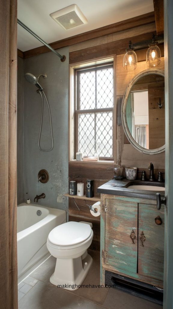 Add vintage touches to soften the industrial feel. Think about using old mirrors or antique storage. This mix of styles makes your bathroom inviting and shows off your unique taste. It also makes the most of your small space.