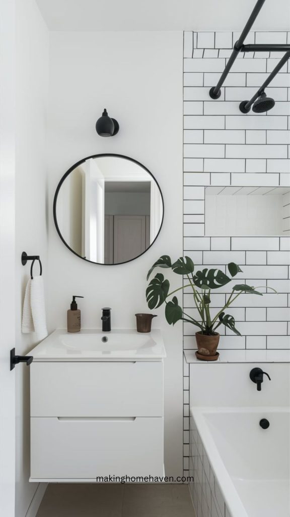 Add simple plants or wooden decor to soften the black and white look. These touches make the bathroom feel cozy and welcoming. This way, your small bathroom gets both style and function with black and white farmhouse decor.