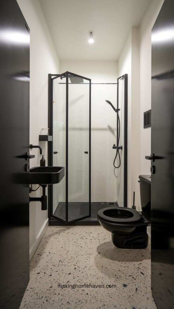 Using a monochrome look in your small bathroom makes design easy and gives a modern feel. Black and white shades make the space look bigger. Choosing matching colors for the floor, walls, and fixtures creates a smooth look that feels big and welcoming.