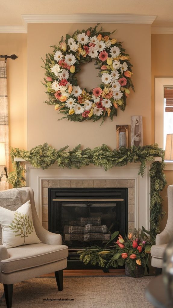 Add more spring touches like a flower garland or a colorful wreath. These details make your mantel look great. By mixing candle heights and textures, you create a beautiful, welcoming space.